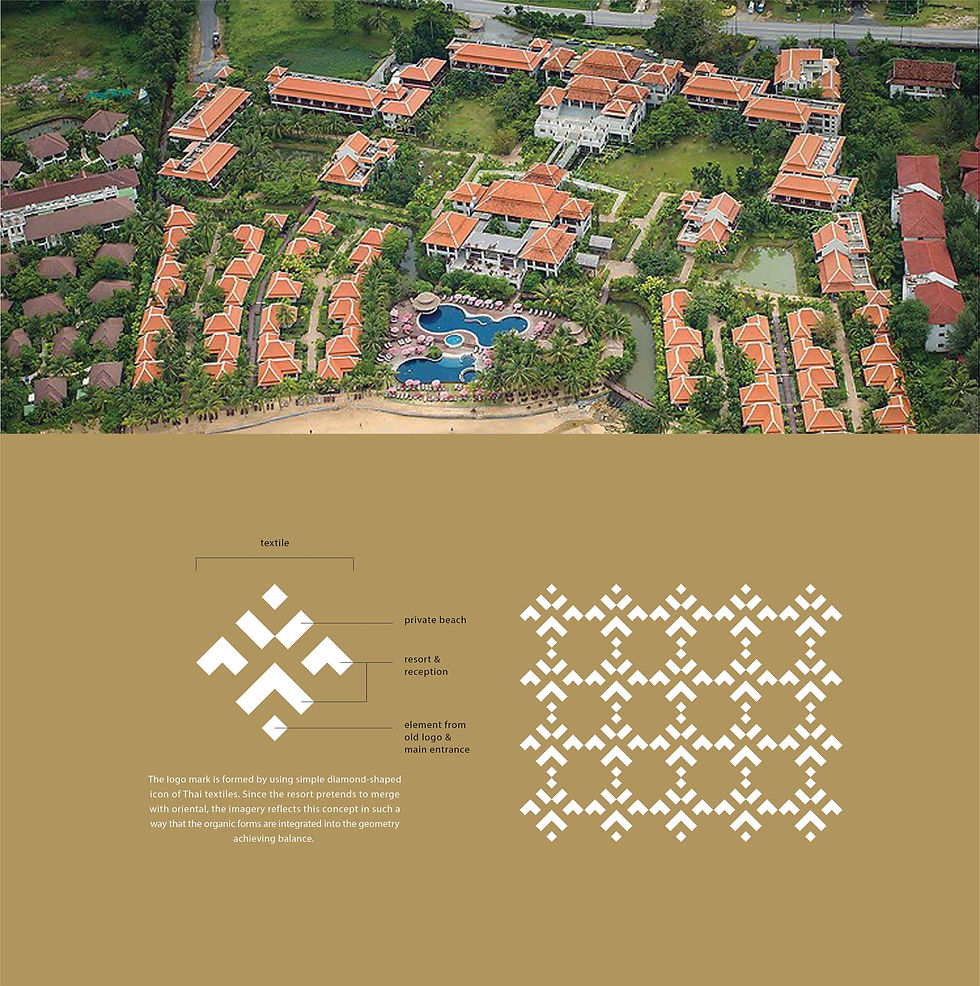 The logo mark is formed by using a simple diamond-shaped icon of Thai textiles. Since the resort pretends to merge with oriental, the imagery reflects this concept in such a way that the organic forms are integrated into the geometry achieving balance.